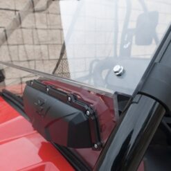 The VersaVent windshield also features a defog mode. No other windshield offers all these features. The vent is made of glass filled nylon, so it’s incredibly durable. The scoop on the front gathers up air off the hood and re-directs it to inside the vehicle so even at very slow speeds there is a surprising amount of air that can come through the vent. The design of the scoop and the gasket between it and the windshield keeps precipitation out while still allowing airflow in—as much or as little as either the driver or passenger desires.